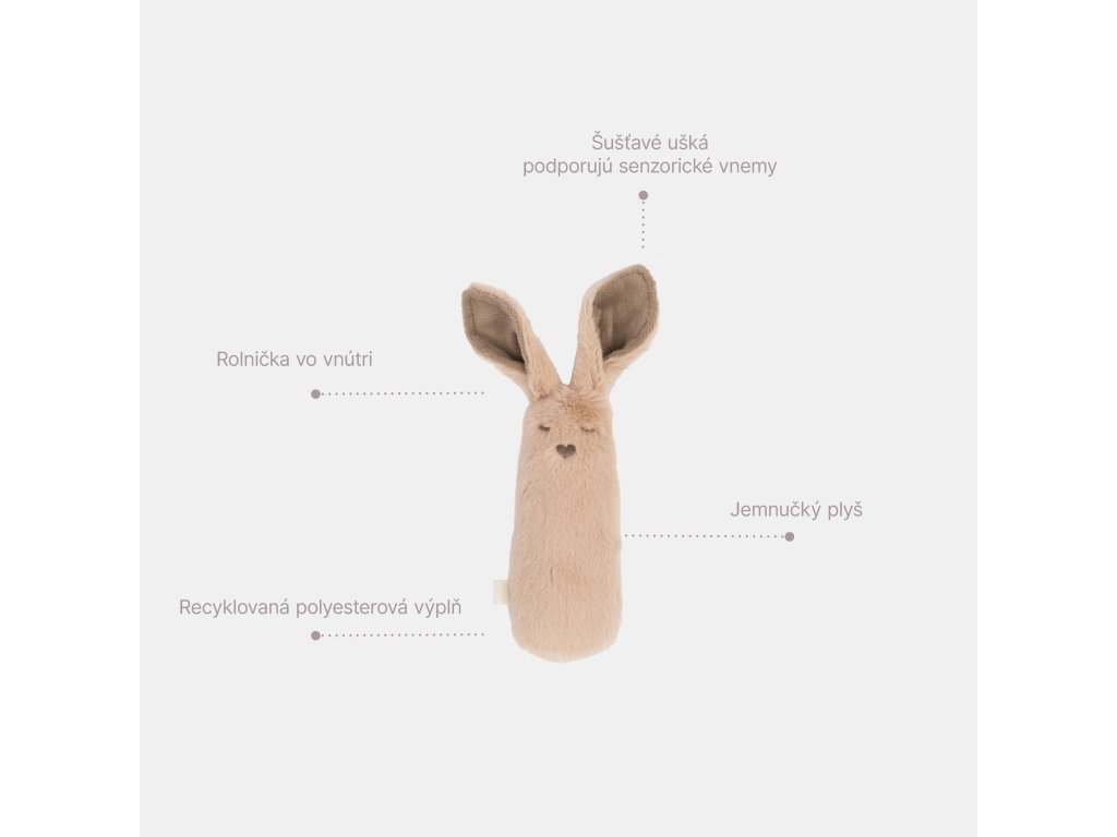 Rolnička vo vnútri, roztomilé šušťavé ušká a jemnučký plyš podporujú senzorické vnemy a usmievavá tvár kengurky pôsobí upokojujúco a priateľsky na dieťatko.