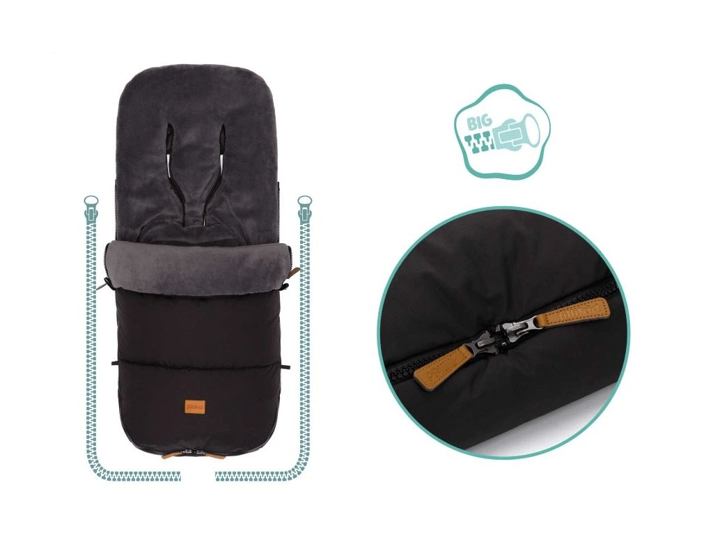 Vďaka celoobvodovému zipsu je možné fusak čiastočne alebo úplne rozopnúť. To umožňuje ľahšie vkladanie aj vybratie dieťaťa z fusaku. Dva gombíky po stranách umožňujú sklopenie prednej časti a vaše dieťa je tak chránené proti prievanu.