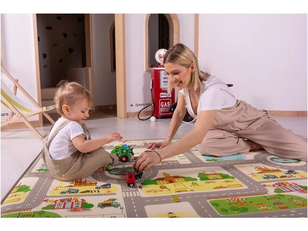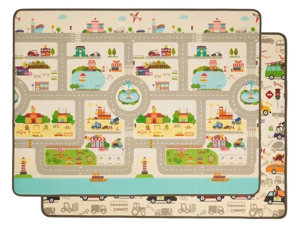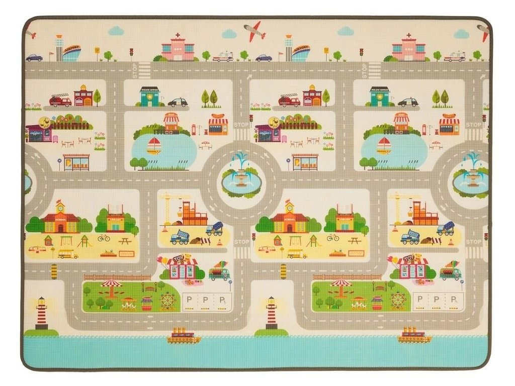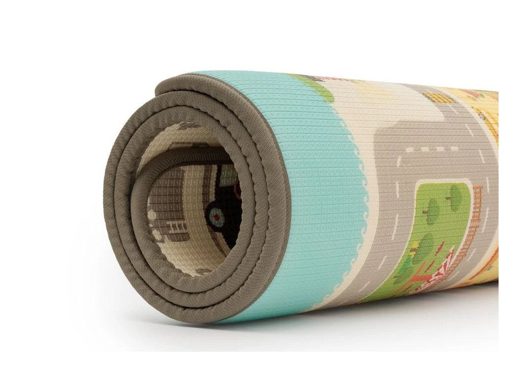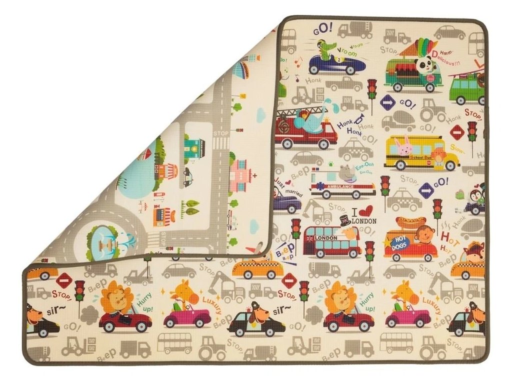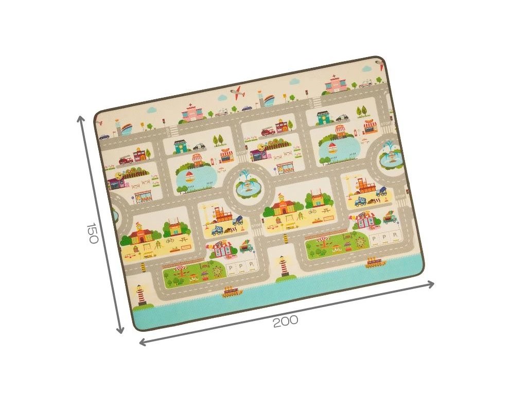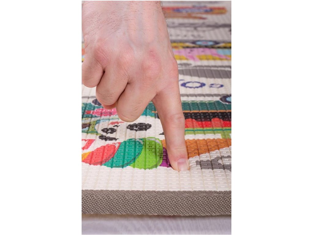 Podložka na hranie s hladkými hranami, vyrobená z hypoalergénneho materiálu, je vhodná pre deti už od narodenia. Má obojstrannú potlač s hravými kresbami, ktoré ľahko upútajú pozornosť detí a súčasne napomáhajú k ich rozvoju.