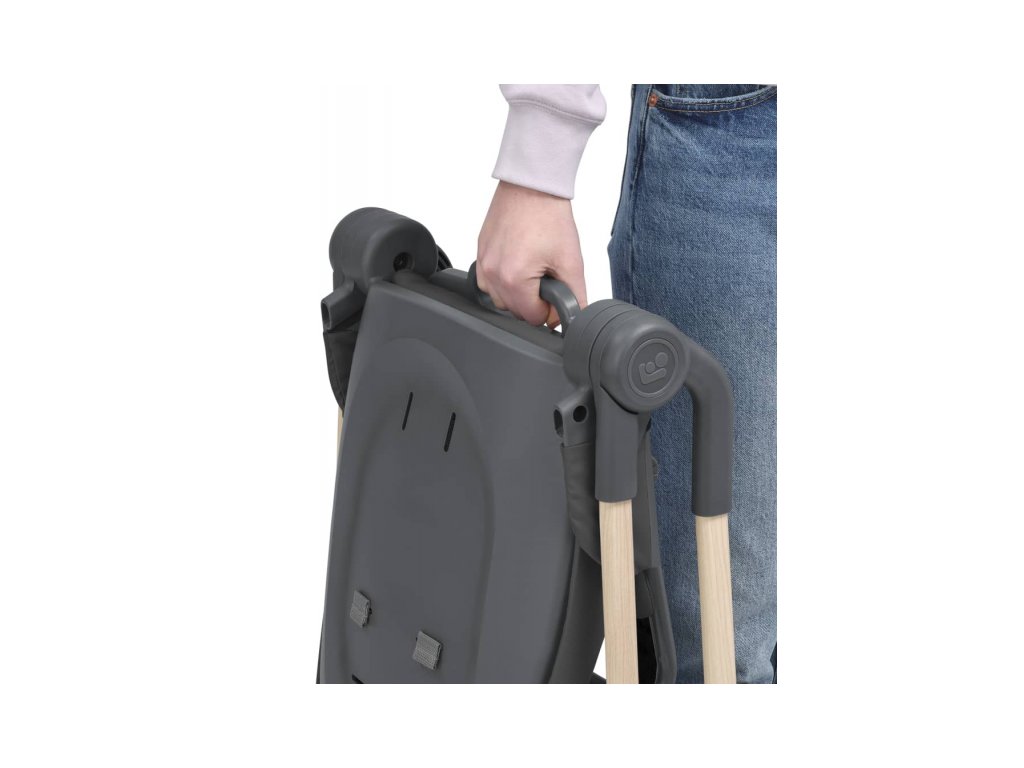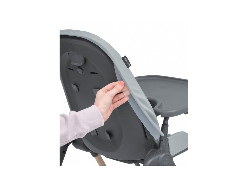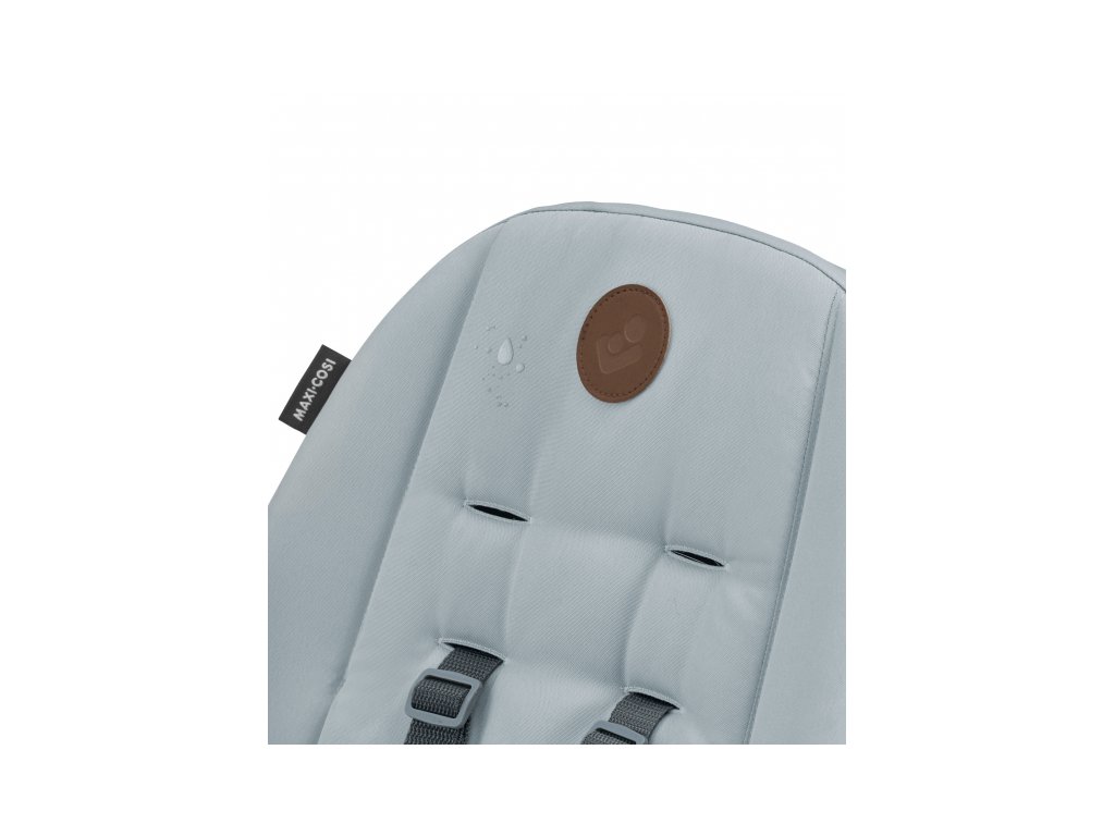 Mäkko polstrovaná sedacia podložka s nastaviteľnými 5-bodovými bezpečnostnými pásmi a opierka nôh poskytujú dieťaťu pohodlné sedenie. Jedálenský pult ponúka tri pozície podľa veľkosti dieťaťa a keď ho nepoužívate, môžete ho zavesiť na zadnú stranu stoličky.