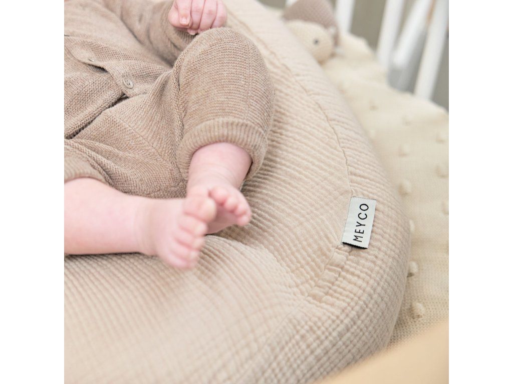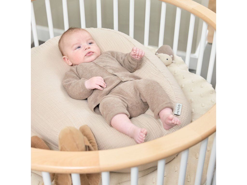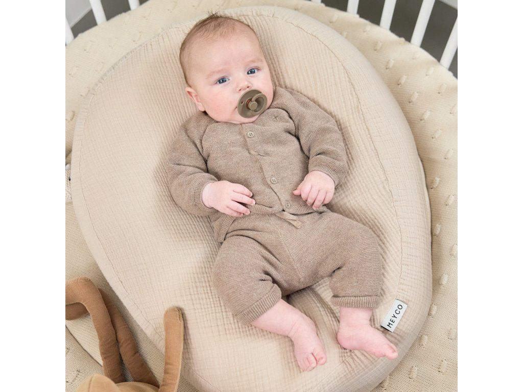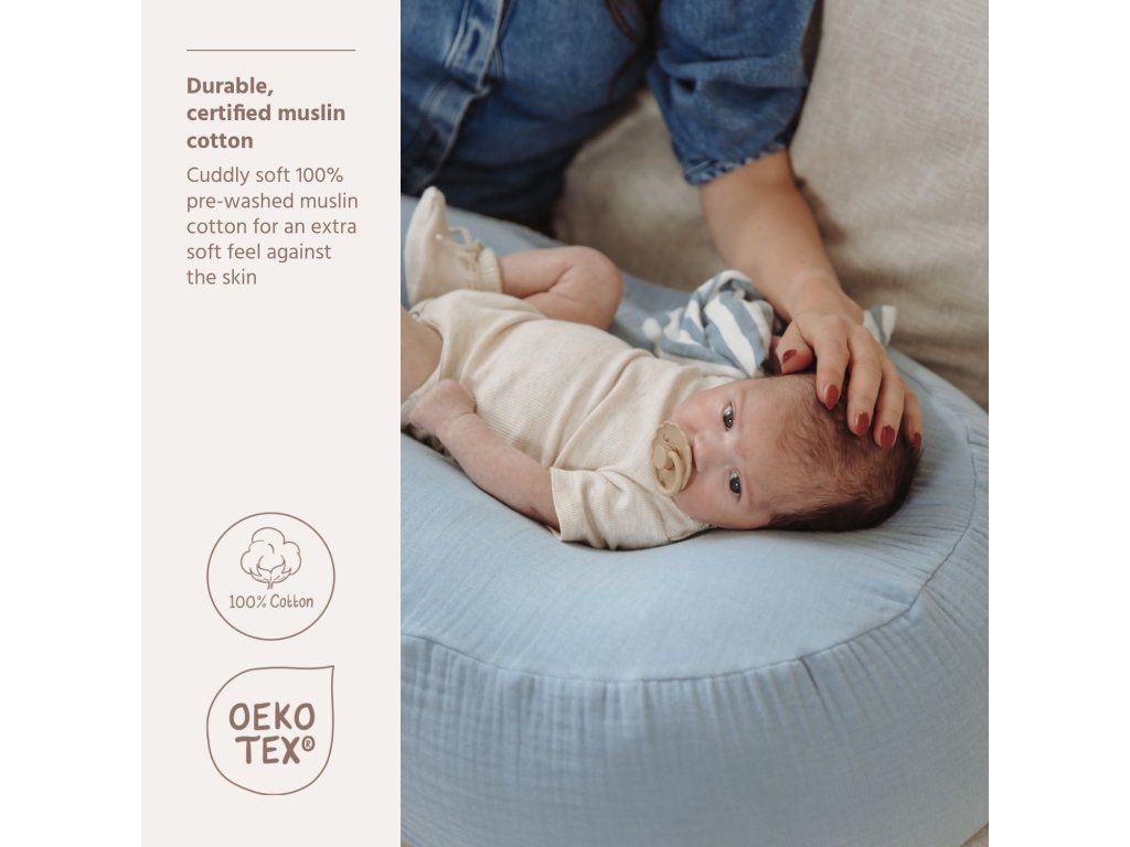 Hniezdo pre bábätko vytvára pocit bezpečia maternice, vďaka čomu je vaše dieťa pokojné a uvoľnené. Obal je vyrobený z mäkkého, vopred vypraného mušelínového materiálu. Vďaka gumičke na spodnej strane môžete tento obal rýchlo obliecť na dojčiaci vankúš.
