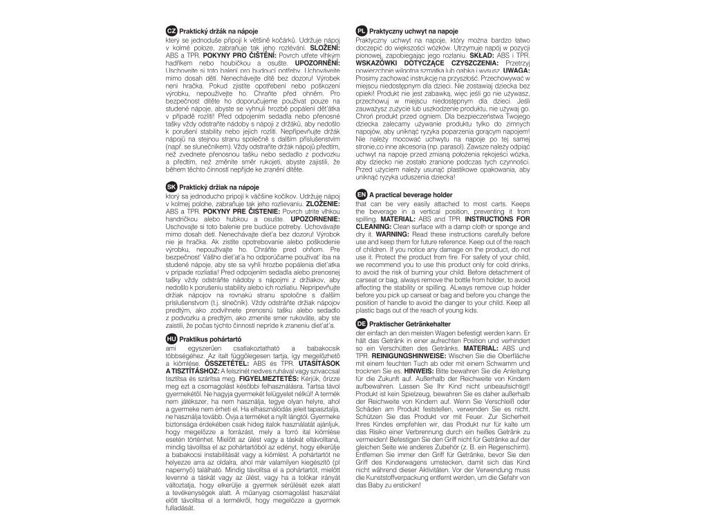 Uschovajte si balenie pre budúce potreby. Uchovávajte mimo dosah detí! Nikdy nenechávajte dieťa bez dozoru! Výrobok nie je hračka. Ak zistíte opotrebovanie alebo poškodenie výrobku, nepoužívajte ho. Chráňte pred ohňom. Pre bezpečnosť Vášho dieťaťa ho odporúčame iba na studené nápoje, aby ste sa vyhli hrozbe popálenia dieťaťa v prípade rozliatia! Pred odpojením sedadla alebo prenosnej tašky vždy odstráňte nádoby s nápojmi z držiakov, aby nedošlo k poručeniu stability alebo ich rozliatiu. Nepripevňujte držiak na nápoje na rovnakú stranu spoločne s ďalším príslušenstvom. Vždy odstráňte držiak nápojov predtým, ako zodvihnete prenosnú tašku alebo sedadlo z podvozku a predtým, ako zmeníte smer rukoväte, aby ste zaistili, že počas týchto činností nepríde k zraneniu dieťaťa.
