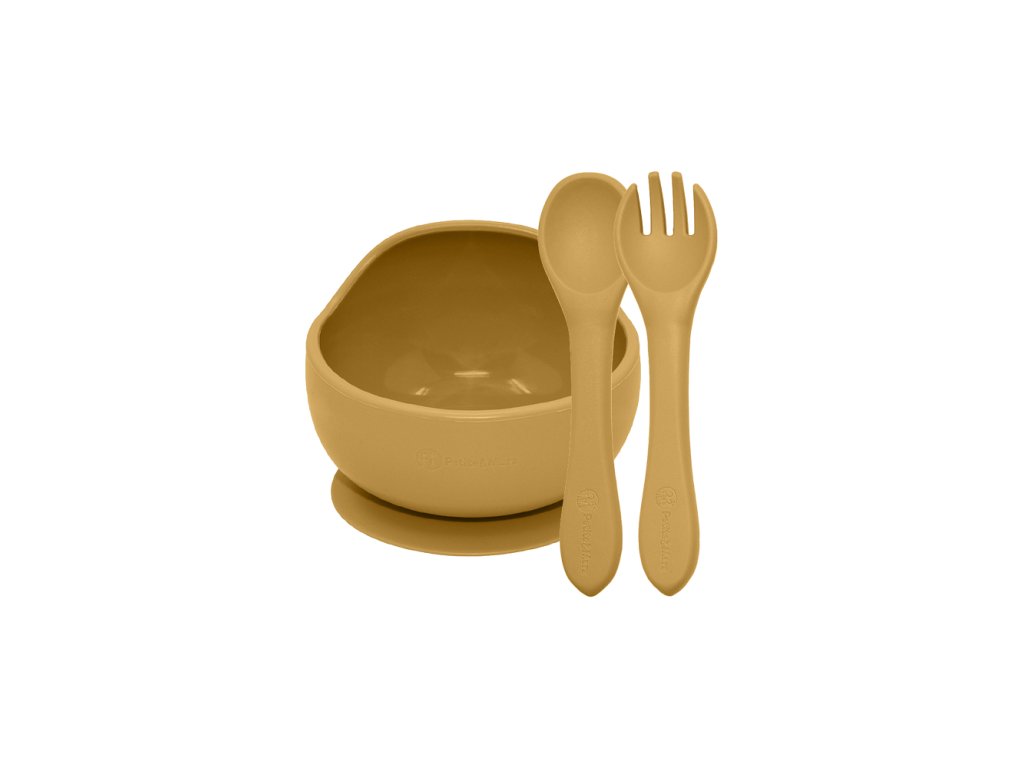 PETITE&MARS Set jedálenský silikónový TAKE&MATCH 2 ks miska + príbor Intense Ochre 6m+
