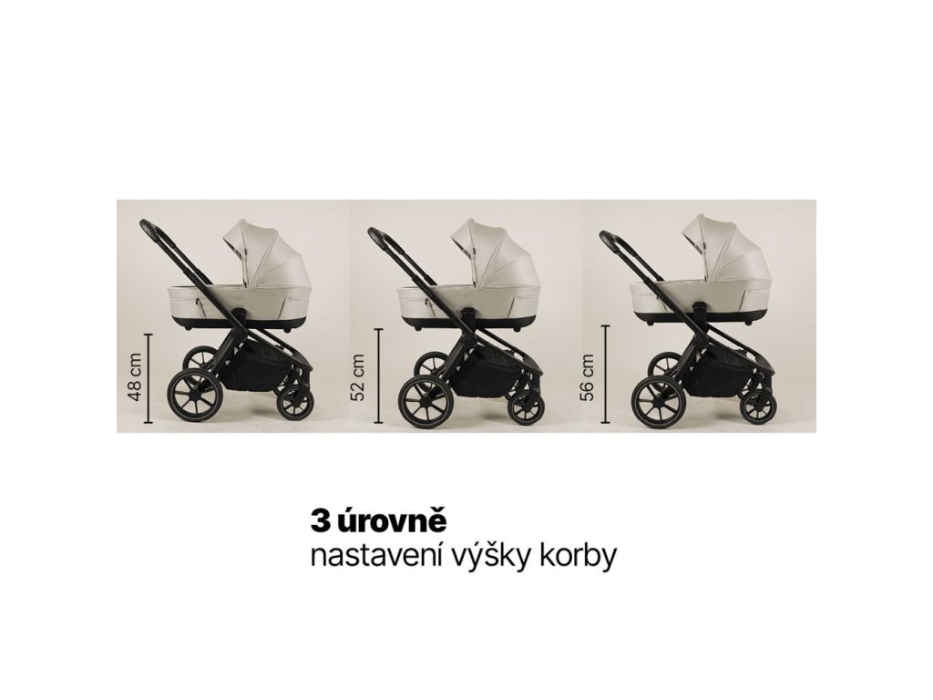 - Nastavenie výšky na podvozku: 3 úrovne – 48 / 52 / 56 cm od zeme
